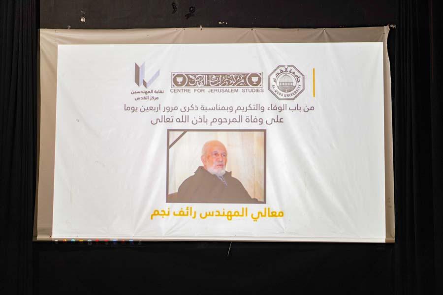 ويشار إلى اهتمام جامعة القدس بمدينة القدس وأهلها ومؤسساتها كونها الجامعة المقدسية الوحيدة التي تنطلق من قلب المدينة المقدسة والتي يقع على عاتقها حمايتها ومساندة أهلها ودعمهم، وكان لابد لها في هذا المقام أن تكرم قامة مثل المرحوم رائف نجم الذي قدم الكثير لهذه المدينة، حيث شغل مراكز عدة في حياته، وتولى منصب وزير الأشغال ووزير الأوقاف في الأردن ونائب رئيس لجنة إعمار قبة الصخرة المشرفة والمسجد الأقصى، وترأس عدة مشاريع للترميم والصيانة، وتولى مناصب استشارية وعضوية مختلفة، وله مؤلفات في تراث القدس العريق.