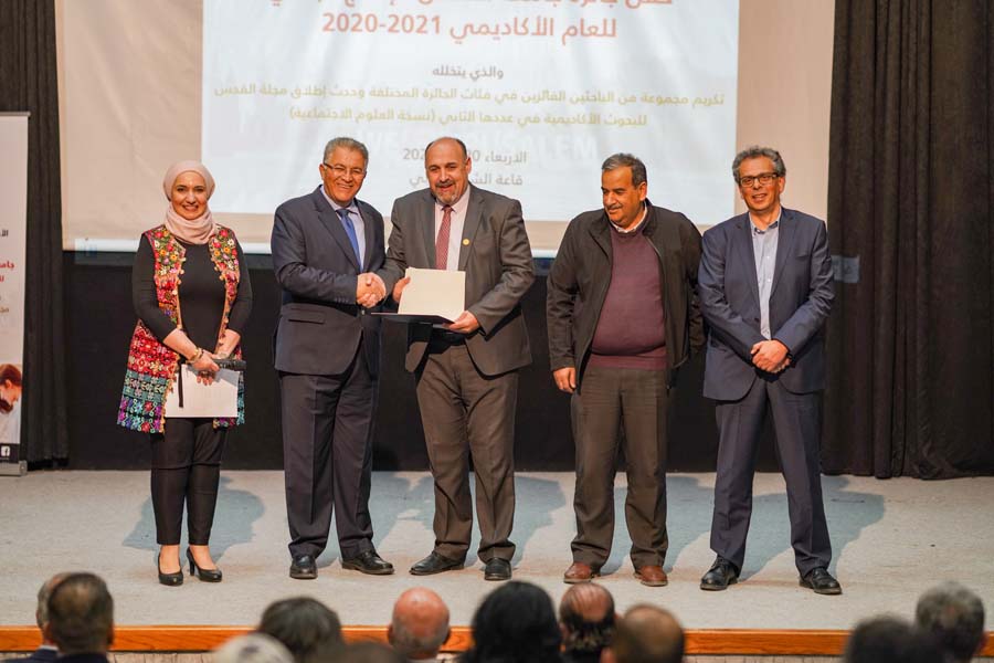 كرمت جامعة القدس باحثيها من أكاديميين وطلبة، وذلك ضمن حفل “جائزة جامعة القدس للإنتاج البحثي للعام الأكاديمي 20202021-“، الذي نظمته عمادة البحث العلمي في الجامعة، وتخلله إطلاق مجلة القدس للبحوث الأكاديمية في عددها الثاني “نسخة العلوم الإجتماعية”.