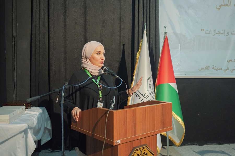 وقدمت نبذة حول واقع البحث العلمي في جامعة القدس ومدى اهتمام الجامعة بالأبحاث العلمية ونشرها في المجلات المحكمة، كما وشكرت اللجان العلمية والتحضيرية من جامعة القدس ومديرية القدس.