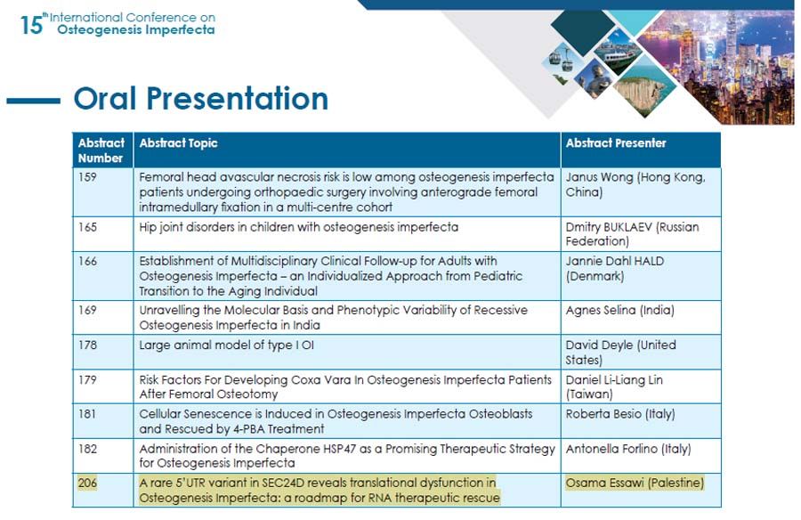 شارك الباحث في جامعة القدس د. أسامة العيساوي في المؤتمر الدولي الخامس عشر لمرض العظم الزجاجي (Osteogenesis Imperfecta – OI) في هونغ كونغ، حيث قدّم عرضًا شفويًا تناول فيه نتائج بحثية رائدة حول التعرف على طفرة وراثية جديدة مرتبطة بمرض العظم الزجاجي، لفهم أسبابه وطرق علاجه مستقبلًا.