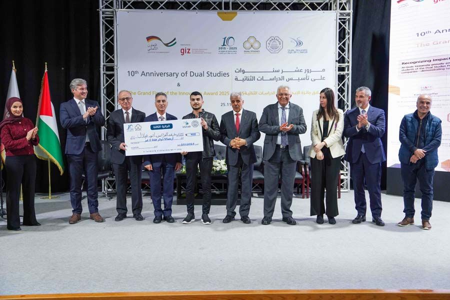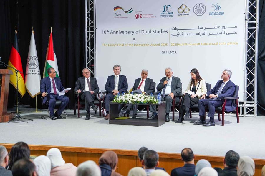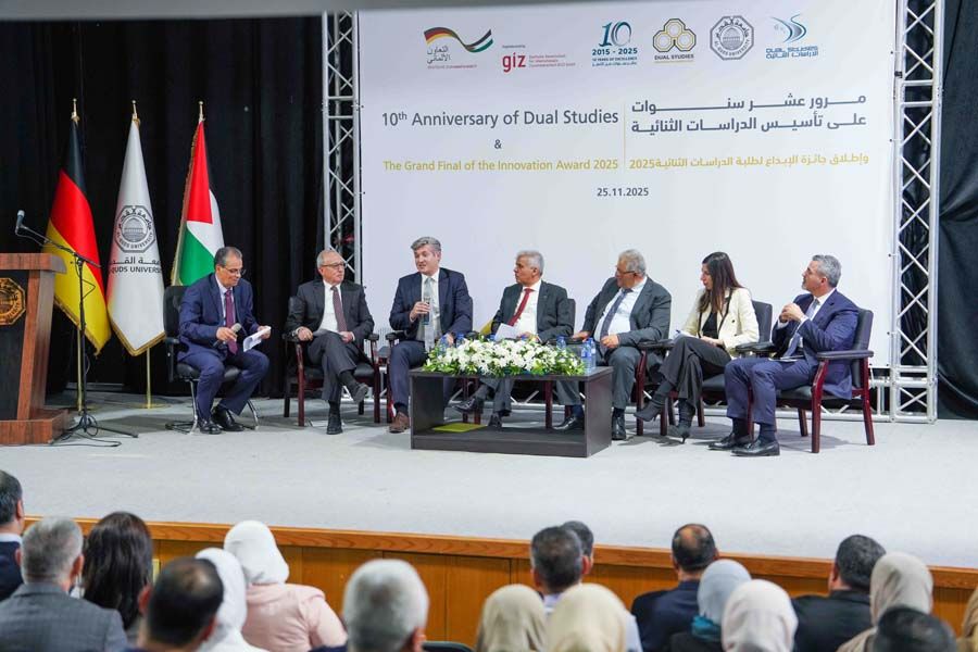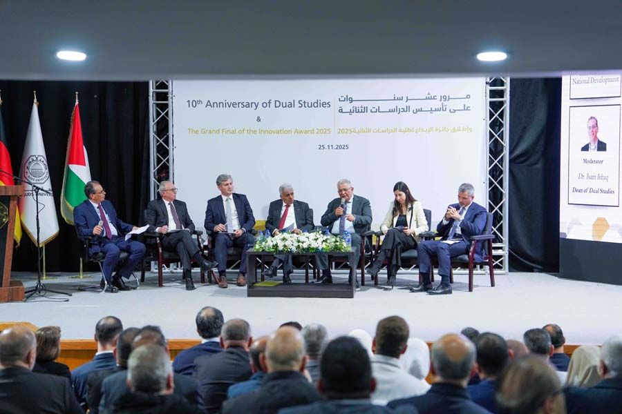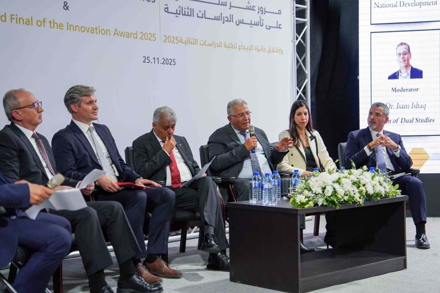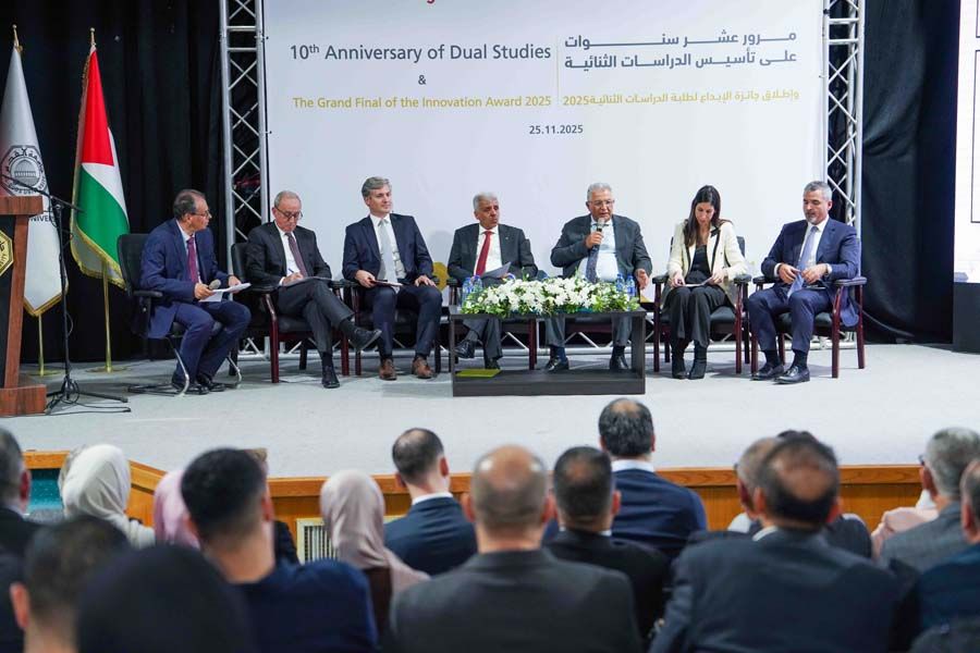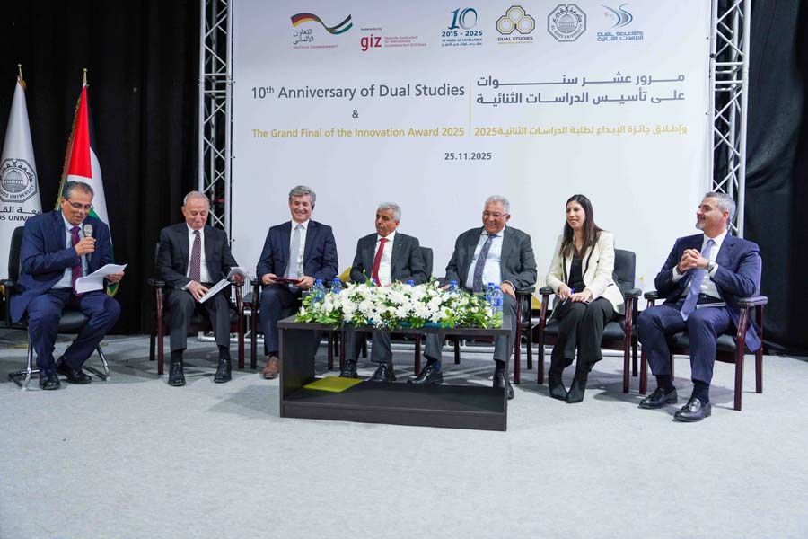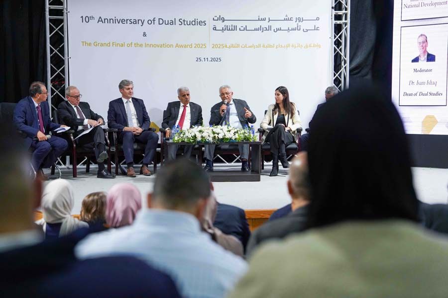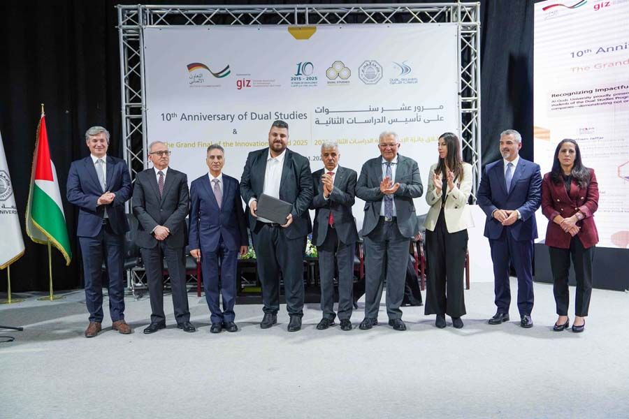 من جهته، أوضح عميد الدراسات الثنائية د. عصام إسحق أن فكرة البرنامج بدأت قبل عشرة أعوام كخطوة بسيطة، لكنها اليوم أصبحت نموذجًا وطنيًا رائدًا يحتذى به، وجاء نتيجة شراكة متينة بين جامعة القدس ووزارة التربية والتعليم، والداعمين الألمان، وأكثر من 300 شركة وطنية، مشيرًا إلى أن الحفل يشكل محطة مهمة في مسيرة برنامج نجح في مواءمة التعليم مع متطلبات سوق العمل.