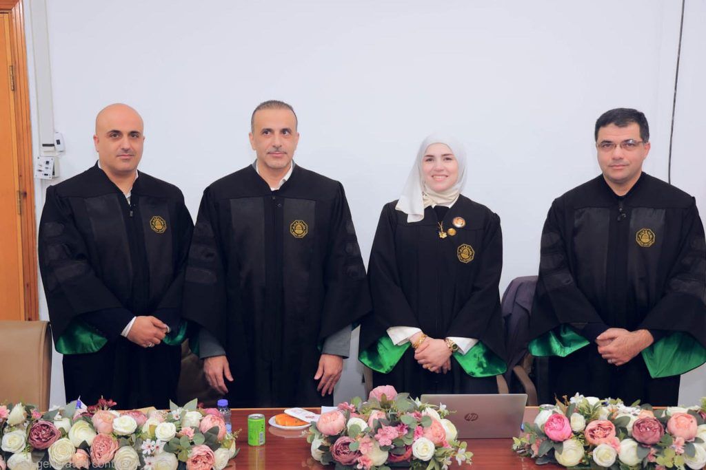 وتكونت اللجنة من: د. فراس بركات رئيسًا، ود. طارق درابيع مشرفًا على الرسالة،ود. أكرم رحال ممتحنًا داخليًا، ود. مهند رزق ممتحنًا خارجيًا.