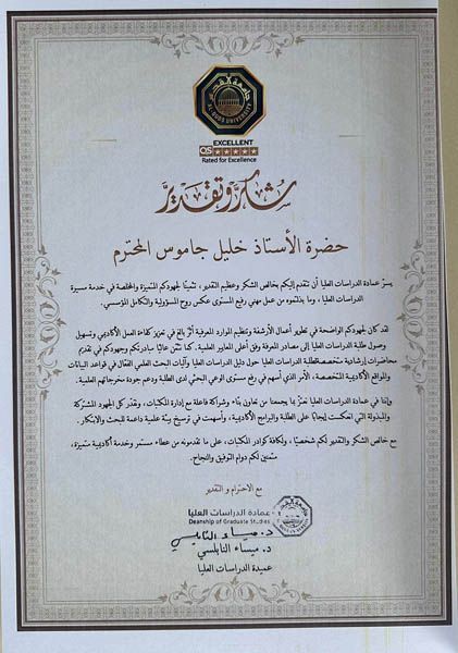 من جانبه، أعرب أ. جاموس عن شكره وتقديره لعمادة الدراسات العليا على هذه اللفتة التكريمية، مؤكدًا عمق العلاقة التكاملية التي تجمع العمادتين، وحرص عمادة المكتبات على مواصلة تطوير خدماتها بما يخدم العملية التعليمية والبحثية في الجامعة.