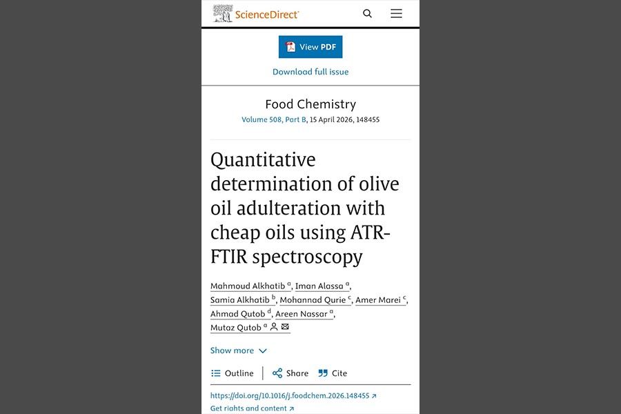 دائرة الكيمياء والتكنولوجيا الكيميائية تنشر بحثًا يطور طريقة سريعة ودقيقة لكشف غش زيت الزيتون