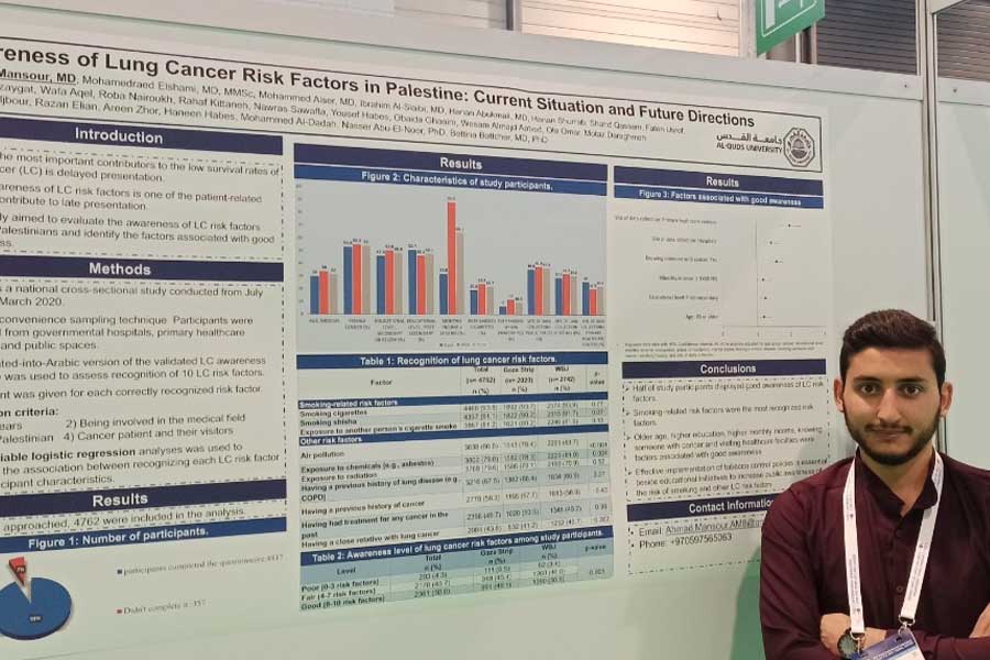 عرض الطالب في كلية الطب البشري في جامعة القدس أحمد منصور ملصقًا لورقته البحثية حول عوامل خطورة سرطان الرئة في المؤتمر العالمي الأكبر لسرطان الرئة (WCLC 2022) في مدينة فيينا، النمسا.