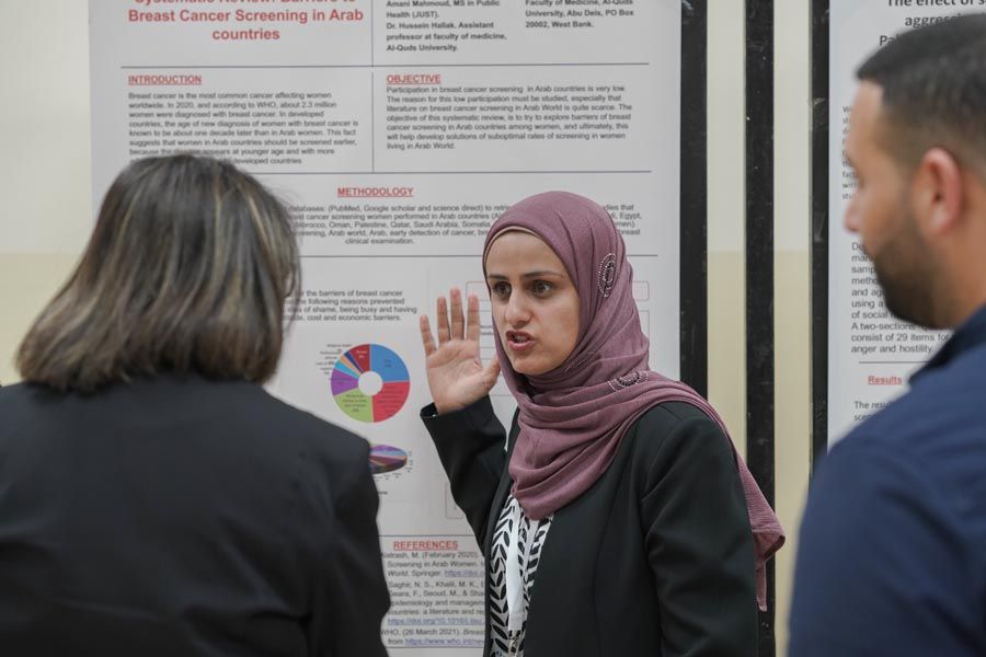 هذا وفازت الطالبات لين دويك وسارة مرقة من طب الأسنان، وفجر سرحان ومهى عودة من الطب البشري في جامعة القدس مناصفة عن جلسات الملصقات البحثية في الصحة العامة والطب، وفي علوم المختبرات طالبات المهن الصحية في جامعة القدس بيان ازحيمان، رغد تميمي، ضحى عيد، زينب قاسم، وطالبات الصيدلة-جامعة القدس ضحى شبلي، براءة حسانين، شيرين شرباتي، وهيا صبح، أسيل غياضة، أسيل مهنا مناصفة عن قسم الصيدلة والبيئة.