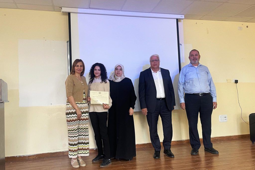 وخلال الحفل، كرمت الطالبتان المتفوقتان تالا أبو عودة وعفاف عابدين، تقديرًا لتفوقهما وتميزهما الأكاديمي، كما تم تكريم مجموعة من الطلبة المتميزين الذين أظهروا التزامًا وإبداعًا خلال مسيرتهم الجامعية، وهم: رنا عويضة، شذى بدرية، رنا جبارين، تسنيم بهلوان، علي الكركي.