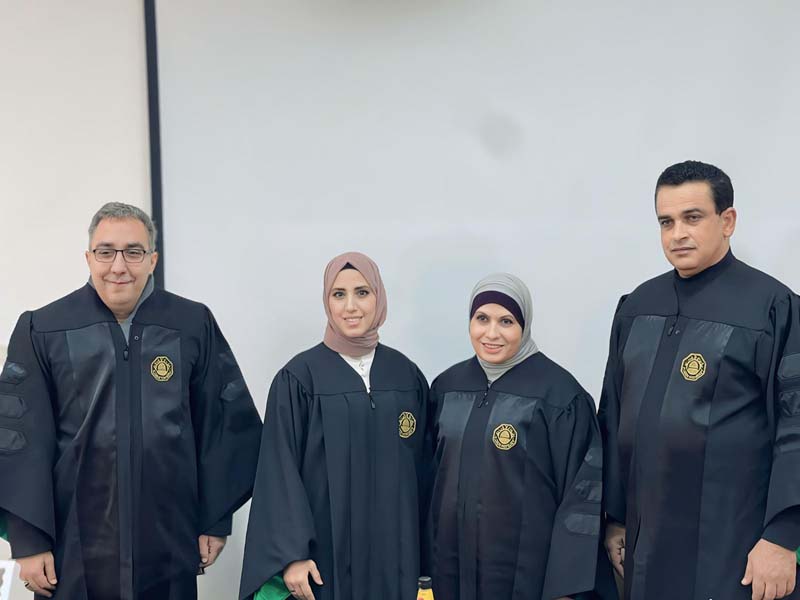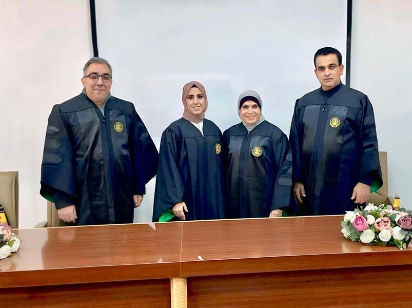 وتألفت لجنة المناقشة من: د. مها نحال رئيسًا للجنة ومشرفًا على الرسالة، د. فريد غريب ممتحنًا داخليًا، د. عماد أبو خضر ممتحنًا خارجيًا من الجامعة العربية الأمريكية.
