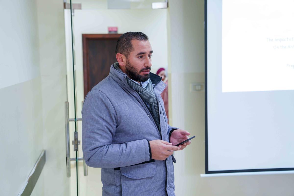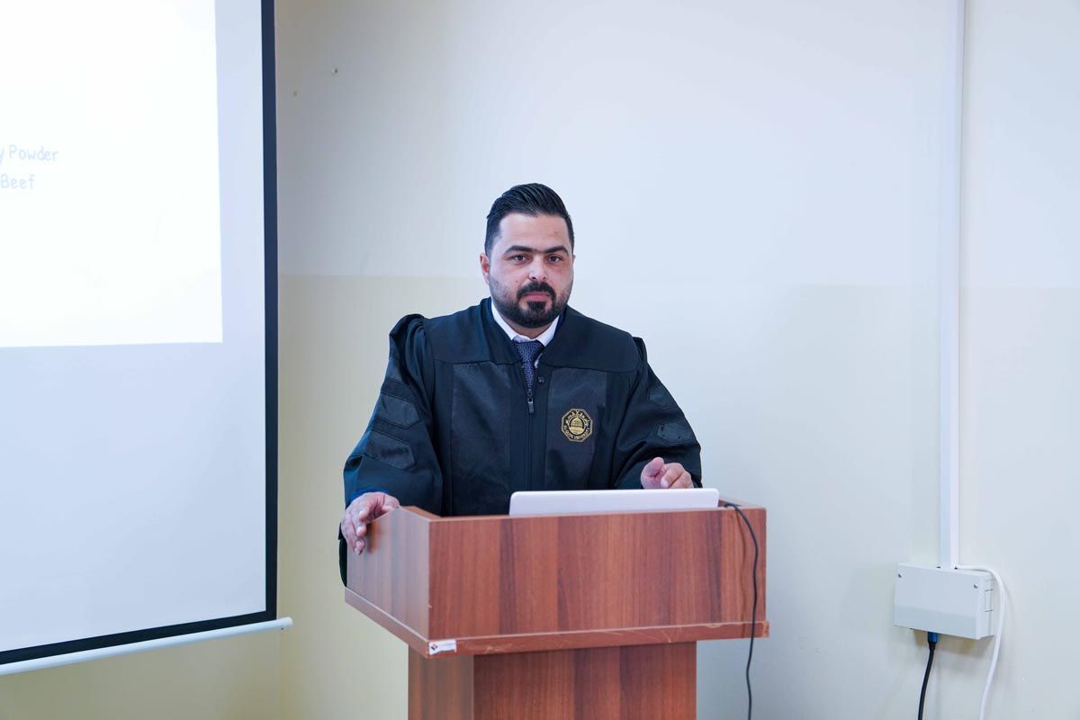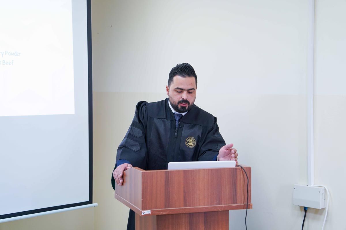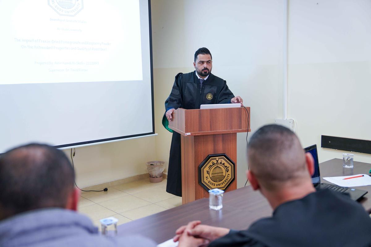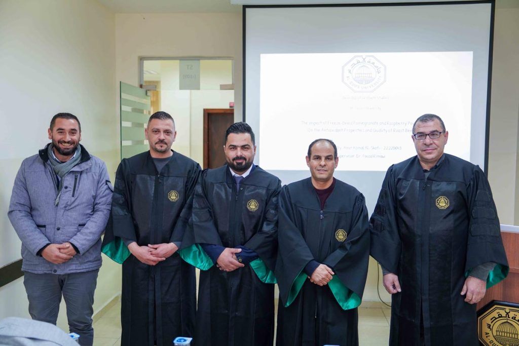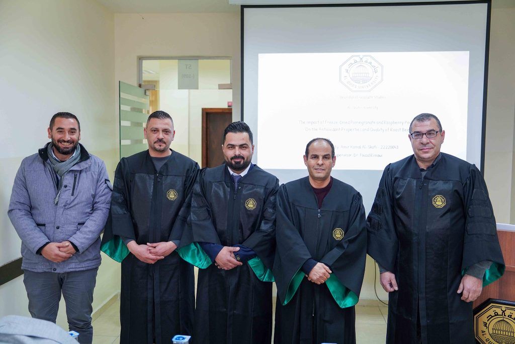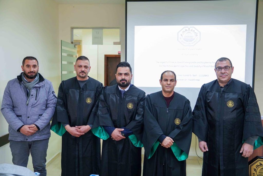 وتكونت لجنة المناقشة من الدكتور فؤاد الريماوي مشرفًا ورئيسًا للجنة، والدكتور زياد عياد ممتحنًا داخليًا من دائرة الهندسة الغذائية في كلية الهندسة – جامعة القدس، الدكتور مهند الأيوبي ممتحنًا خارجيًا من قسم التصنيع الغذائي في جامعة الخليل.