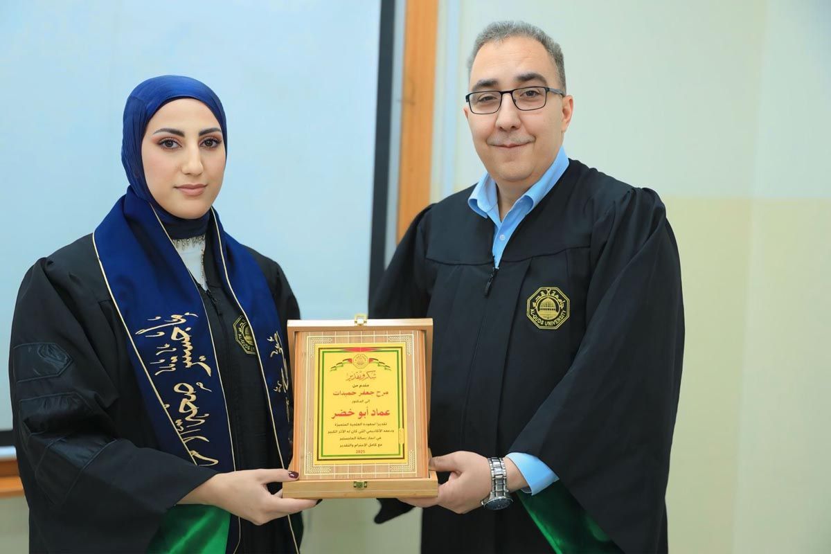 وتكونت اللجنة من: المشرف د. عماد خضر، الممتحن الداخلي د. سمر الجلاد، الممتحن الخارجي د. إيمان تيم.