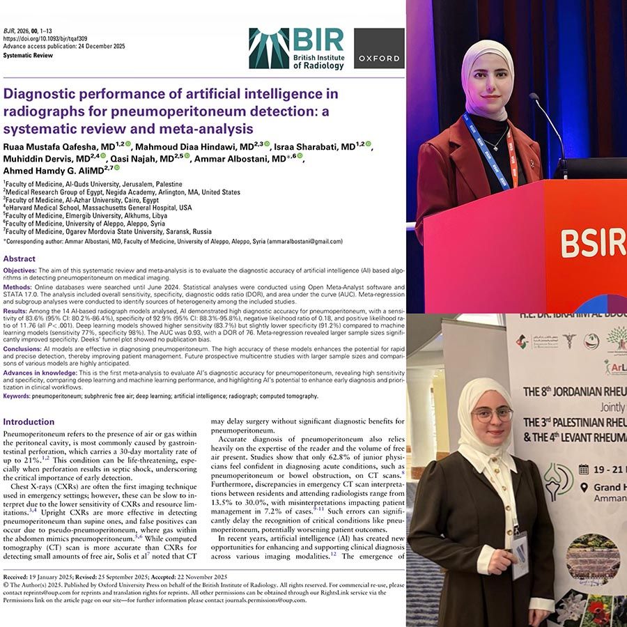 نجح فريق بحثي بقيادة خريجتي كلية الطب البشري بجامعة القدس الطبيبتين رؤى مصطفى قفيشة وإسراء شرباتي بنشر دراسة علمية في المجلة البريطانية للأشعة (BJR)، المصنفة في الربع الأول (Q1) وفق Scopus، تناولت دور الذكاء الاصطناعي في الكشف عن وجود الهواء داخل تجويف البطن – والناتج غالباً عن انثقاب في الجهاز الهضمي – (Pneumoperitoneum)، وذلك بالتعاون مع فريق بحثي دولي يضم نخبة من الباحثين.