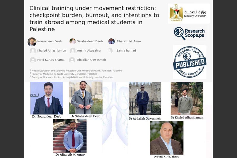 نشر مجموعة من طلبة جامعة القدس وجامعات فلسطينية أخرى وأطباء من وزارة الصحة الفلسطينية دراسة علمية جديدة في مجلة BMC Medical Education المصنفة ضمن الفئة الأولى (Q1) وبمعامل تأثير 3.8، بعنوان: “Clinical training under movement restriction: checkpoint burden, burnout, and intentions to train abroad among medical students in Palestine”، بإشراف وحدة البحث العلمي في وزارة الصحة الفلسطينية.